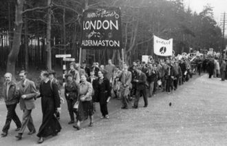 On the first Aldermaston March in 1958 over Easter (these Easter Marches still exist), the sign of the CND, designed by Gerald Holm, featured prominently and later became an international peace symbol (cf. 'pm.magazine'). Symbol, Aldermaston March and its slogan "Ban the Bomb" soon became part of 1960s' youth culture.